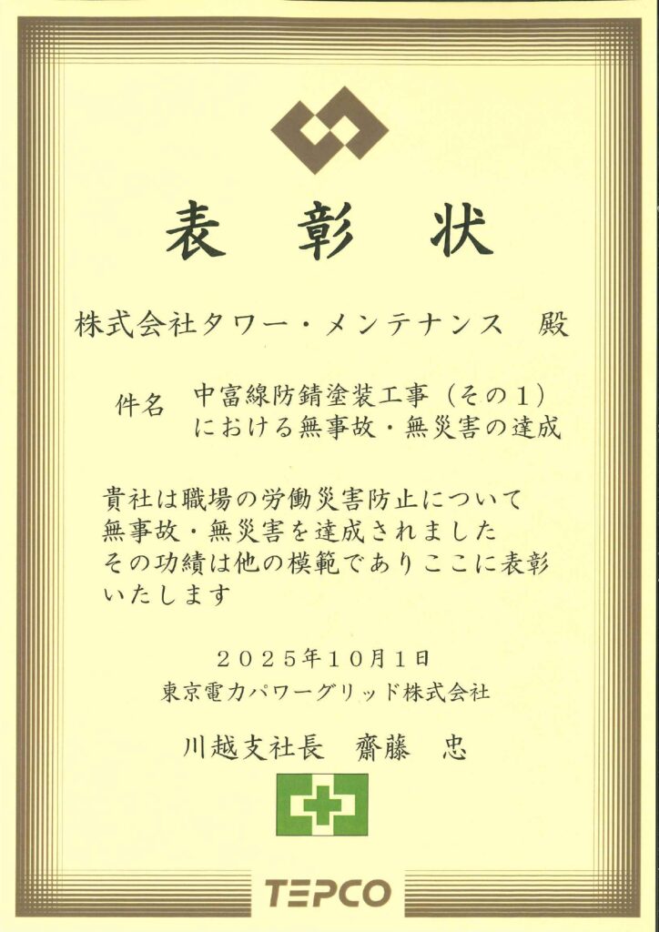 東京電力パワーグリッド株式会社 川越支社長様より『表彰状』をいただきました