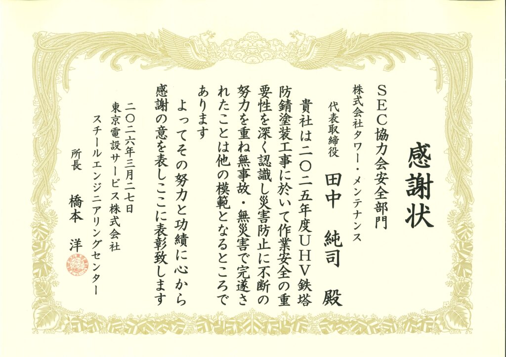 2025年度UHV鉄塔防錆塗装工事に於いて無事故無災害完遂の模範として