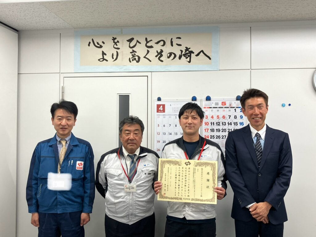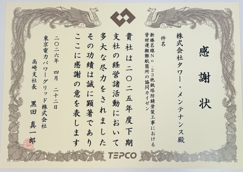東京電力パワーグリッド株式会社 高崎支社長 黒田真一郎様より「感謝状」をいただきました